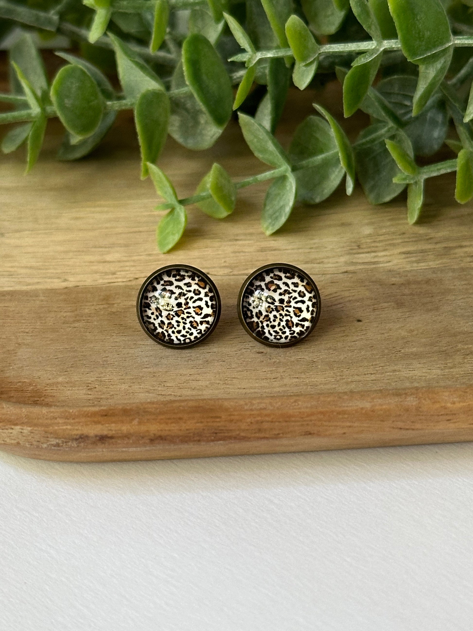 - 12mm Cheetah Print studs in bronze-toned setting