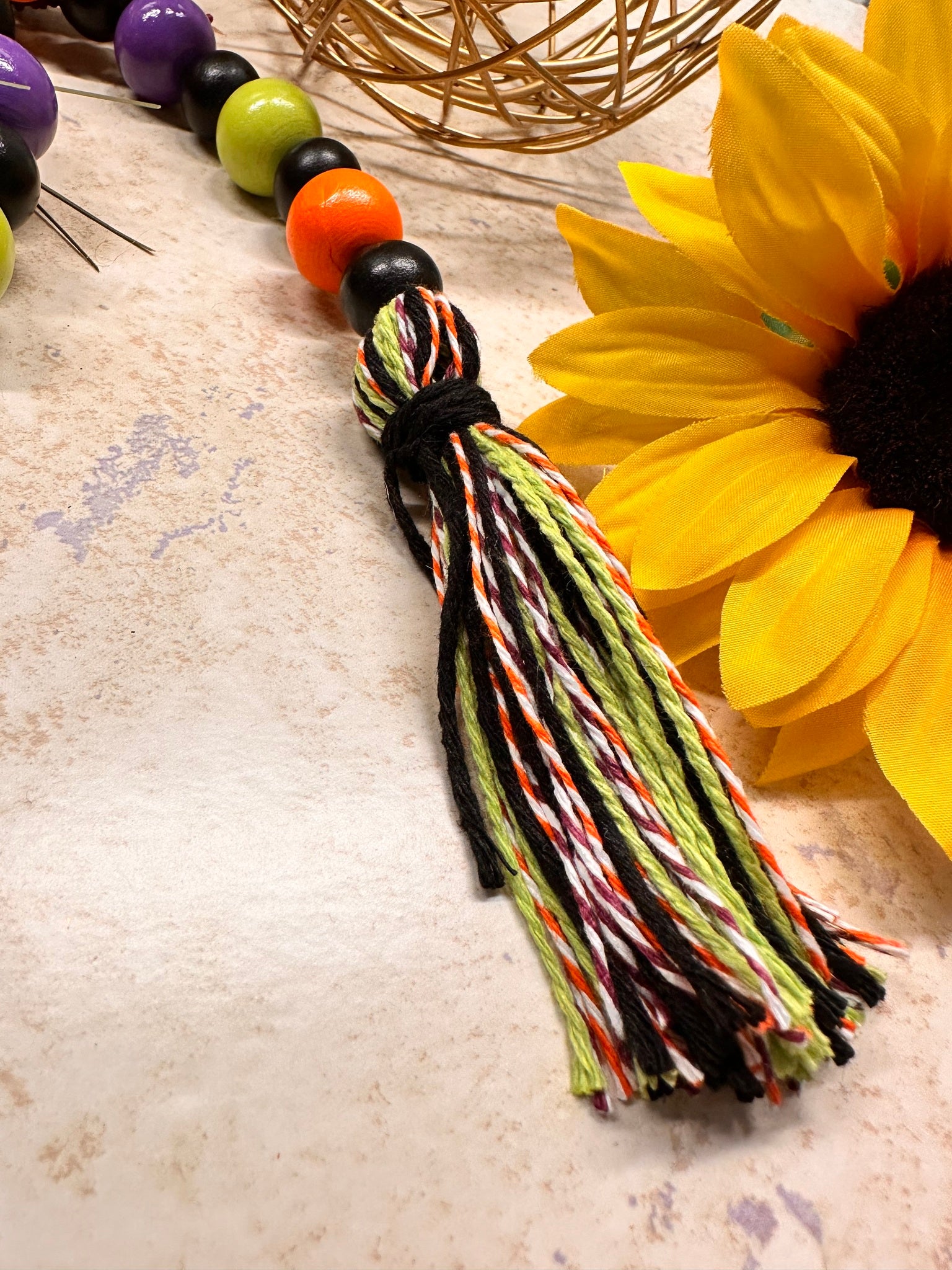 - Bead colors include black, orange, lime green, purple